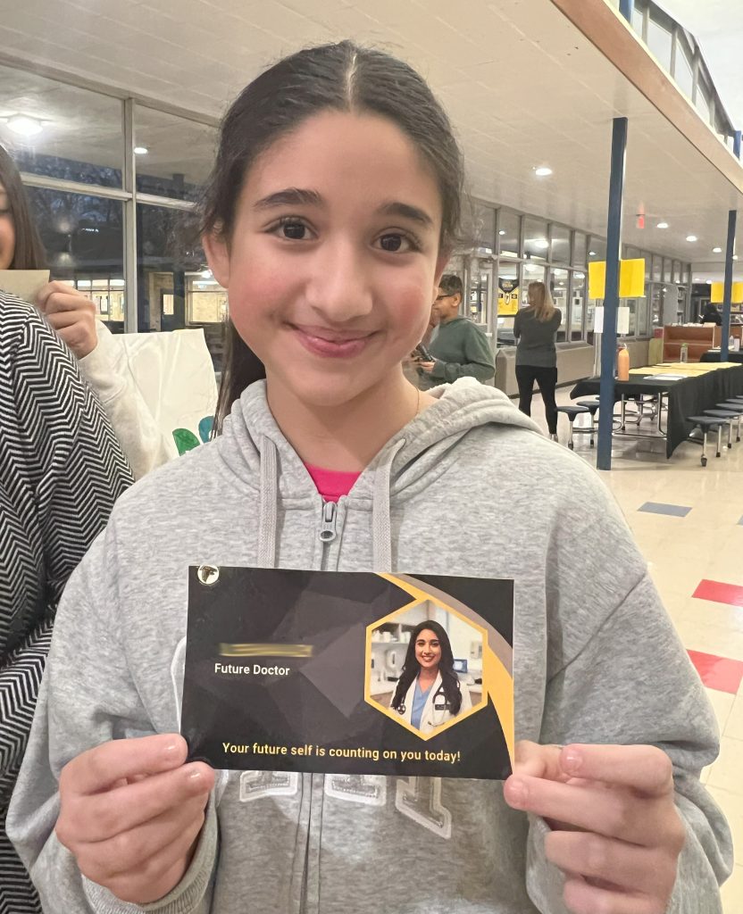 Staff took each child’s photo and put it through AI to create an image of the student as their future self in their chosen career. Each card had the student’s name, their future career and the phrase “Your future self is counting on you today!”